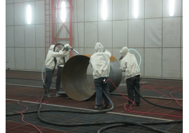 噴砂采用壓縮空氣為動力,以形成高速噴射束將丸料(金金剛砂、鐵砂、鋼丸)高速噴射到需要處理的工件表面,使工件表面的外表面的外表或形狀發(fā)生變化,由于丸料對工件表面的沖擊和切削作用,使工件的表面獲得一定的清潔度和不同的粗糙度,使工件表面的機(jī)械性能得到改善,因此提高了工件的抗疲勞性,增加了它和涂層之間的附著力,延長了涂膜的耐久性,也有利于涂料的流平和裝飾。